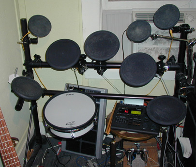Percussion "Kit" Roland TD-10 V-Drum Module (expanded) Roland V-Drum PD120 Snare Various Roland and Duaz pads Roland FD-7 Hi Hat Trigger Additional Modules (not pictured) Alesis D4 Roland R5
