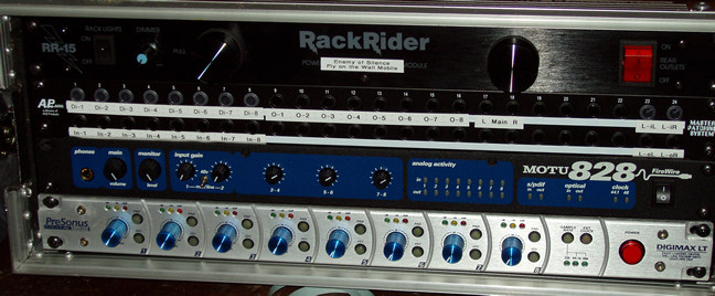 May 2007 UpdateObviously this site is in need of drastic updating! Much has changed in the EoS world, and I'll be getting it up here soon. Really, no kidding! We've moved to NW New Jersey - to an area that reminds one why NJ is called the Garden State. Our new abode has the space for me to finally set up my studio properly. I'm almost finished setting up, and then I'll update this site. So check back! In the meantime, I do have some pictures of progress HERE Cheers, EoS - 2007 -------------------------------------------------------------------------------------------------------------------- The humble home studio has been growing since 1985. From ultra-cheap 4-track cassettes to better 4-tracks, to 8-tracks, to 70+ digital HD recording, it's been an interesting road. Currently, all recording is direct to hard disk using Cakewalk's Sonar2 XL and Emagic's Logic Audio Platinum via Motu 828 Firewire, Echo Audio Layla, Layla24 & Gina audio interfaces. I'm currently in the midst of completely rewiring & reconfiguring the studio. While all my recordings of recent years have been via Cakewalk & Sonar, I'm switching over to Logic 5 as my primary DAW software. This is not for lack of any features in Sonar - in fact Sonar 2 XL is a truly great package. However, the studio has reached a state of complexity that is best handled by Logic's integration with Sound Diver and with the Logic Control & XT control surfaces. It was in fact the LC units that finally made me dedicate my project time to Logic, as it integrates perfectly with the software - providing hands on control and automation of nearly every aspect of the software- including plug-in effects. Sonar will continue to be used to run DXi Soft-synths etc. The following are a few pictures from within, what Donnelly refers to as "The house of many blinking lights". The DAW Section picture reflects recent changes, but the rack set-up is being redone. This page will be updated soon, to reflect the other changes Click HERE to view page that describes the computer, digital audio, and midi configuration. 1/23/03 - Update: The DAW Section has been uptated to reflect... What's this weird shiney silver/gray thing with all the holes in it? OMG! EoS bought a Macintosh G4 DP 1G tower this summer? Yep. Long story in there somewhere I'm sure. Does it 'just work'? Nope. Well, it does now, but I've had more perplexing problems with the new G4 than with any pc I've owned - most of them hardware incompatability related. Plug and play? Yeah right. Anyway, the Mac is just running Logic 5.5 and Waveburner Pro 2.2, and houses the UAD-1 DSP card. The move to Firewire hardware has paid off though... In addition to the G4, I replaced my notebook pc this summer. The new one is a Vaio GRX560 PIV 1.6Ghz with 512MB anda 16.1" (1600x1200) LCD display. Oh what a wonderful thing that screen is for working with Logic or Sonar! Anyway, as I've been configuring the studio racks, the audio section has gone into a rack case so that it's all mobile. The Audio case contains a PL8 power and light module, a patch-bay, the Motu 828, and a Digimax LT 8-channel preamp to lightpipe converter. This makes a very simple, powerful, and portable rig that is easily switched between the laptop and the Mac.