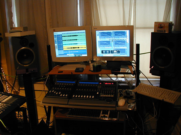 The studio currently uses 2 computers - a new Apple** MDD G4 1GHz Dual Processor PowerMac, and a PIII 1.1 GHz (dual boot -Windows ME/Windows XP Pro) machine with 768 MB of ram. Both PC's have dual-head VGA cards with LCD Panel displays (2 17"-ers on the G4). In addition to the computers in the studio, I use a Sony Vaio GRX-560 (PIV 1.6 GHz)laptop. This machine has a beautiful 16.1" (1600x1200 resolution) display that works great for audio apps. Logic needs a lot of screen real estate for having multiple windows and views open, and this laptop is a joy to work with. Logic uses a USB key based authorization device that contains the licenses for my software - it can be moved between the Mac and the laptop and allows me to access all my emagic software on either machine.