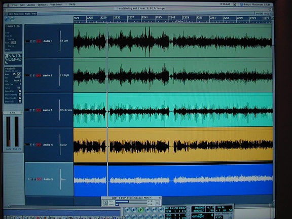 The Mac G4 also contains a Universal Audio/Mackie UAD-1 DSP card for effects processing. The effects provided by this card are fantastic- especially the vintage compressor models 1176N and LA2A. Currently Logic handles these (VST) plugins much better than Sonar using a DX/VST wrapper. (note, that my change in a week or so with DX implementation by the UAD-1)
