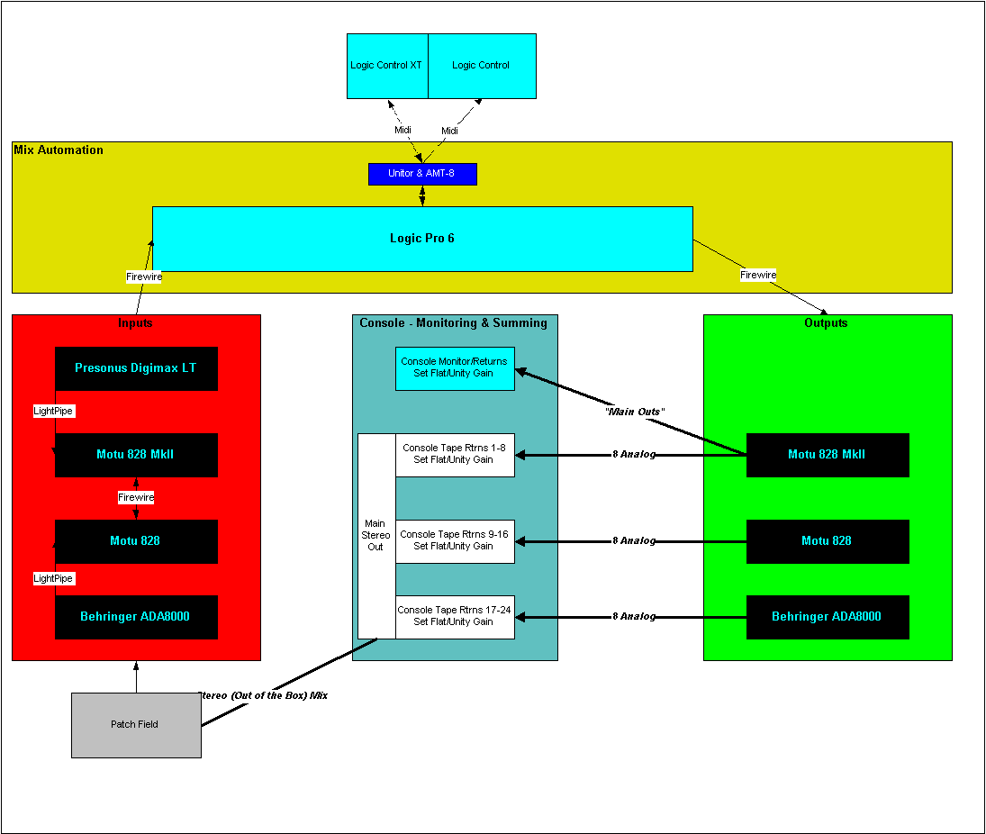 This provides 34 analog inputs (20 MIc-pre's) and 26 analog outputs. The main 24 audio outs are routed into my mixing console, which is set flat -
